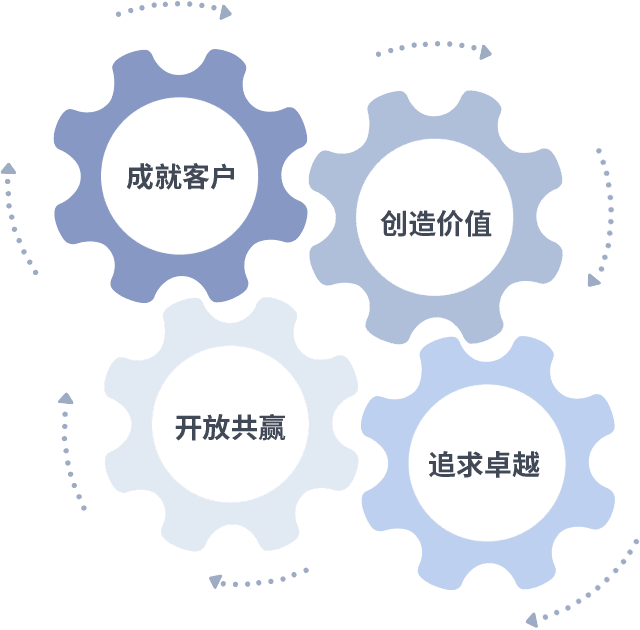 成就客户是一切决策的出发点,,,创造价值是衡量所有工作的标准,,,,追求卓越是我们做事做人的态度,,开放共赢是我们的格局也是最终的结果。。价值观的齿轮环环相扣,,推动着组织里的每个人不断向前。。