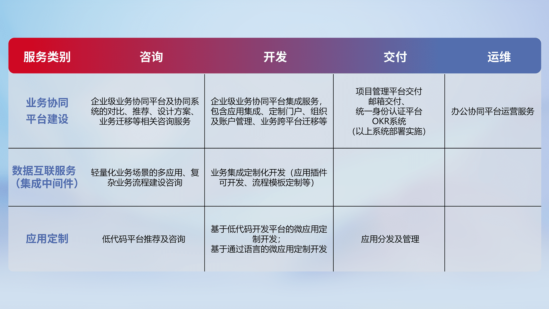 针对钉钉、、、、企微、、、IDaas等平台级产品提供产品的规划、、、方案、、交付、、、、定制化开发等服务,,实现如统一协同办公、、、智能客户服务、、、混合会议管理、、、智能数据查询、、、、等业务场景,,,实现数字化转型。。。